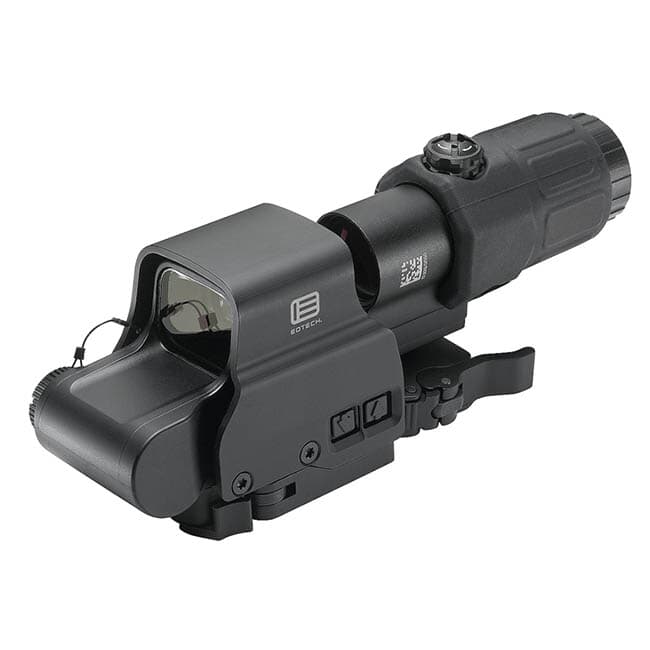 The 3x Eotech magnifier with Flip-to-Side (FTS) mount provides superior light transmission and the large field of view puts the competition to shame. Both units offer quick release throw levers for easy attachment and removal.
