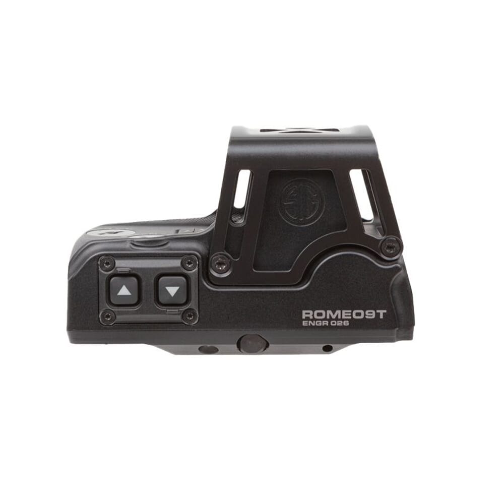 The ROMEO9T is a MIL-SPEC Red Dot Sight that comes packed with Sig Sauer exclusive features. It utilizes an innovative dual reticle design composed of both a 1 MOA red and a 2.5 MOA green dot with independently zeroed emitters, as well as a user selectable 65 MOA ring. This makes the ROMEO9T perfect for use on suppressed weapons, allowing the operator to zero one reticle for supersonic ammunition and the other for subsonic ammunition. The dual reticle design is also useful for zeroing one reticle at a standard distance, and the other for a CQC distance, or for use on a caliber exchange kit. In addition to its unique dual reticle configuration, the ROMEO9T comes standard with a wide assortment of secondary features. The proprietary design of the emitters is optimized to mitigate downrange light signature, allowing the user to operate undetected. A titanium shroud helps protect the lenses and internals from drops and minor impacts, and an IPX8 rating ensures waterproof and fog proof performance. In addition, the ROMEO9T boasts an impressive 50,000 hour runtime, as well as a backup reserve power source to allow the ROMEO9T to operate for an additional 10 hours without a battery.